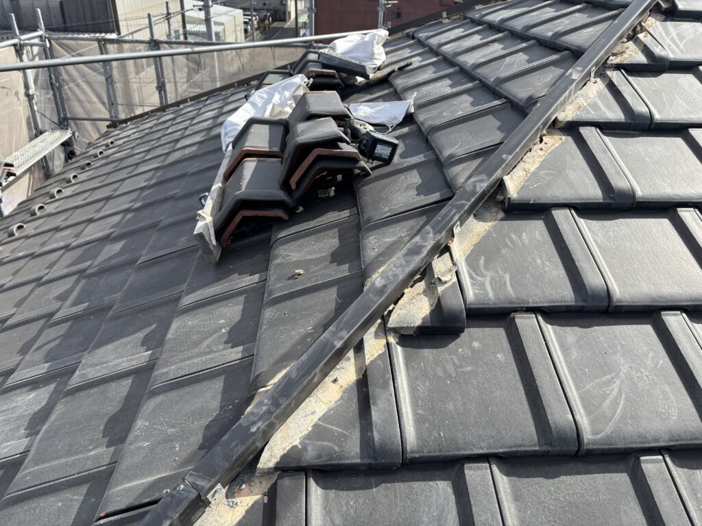 強風時に瓦が落ちてきて、棟付近の瓦がずれている、さらに棟瓦を固定している釘が抜け掛かってることが判明