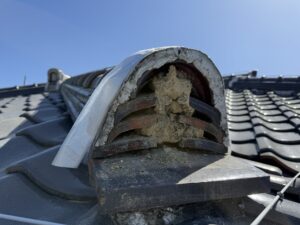 棟瓦を解体したところです。土で瓦を固定した、昔ながらの工法です。現在は土を使わず、瓦を桟木に引っ掛け、釘で一枚一枚しっかり固定することがほとんどです。