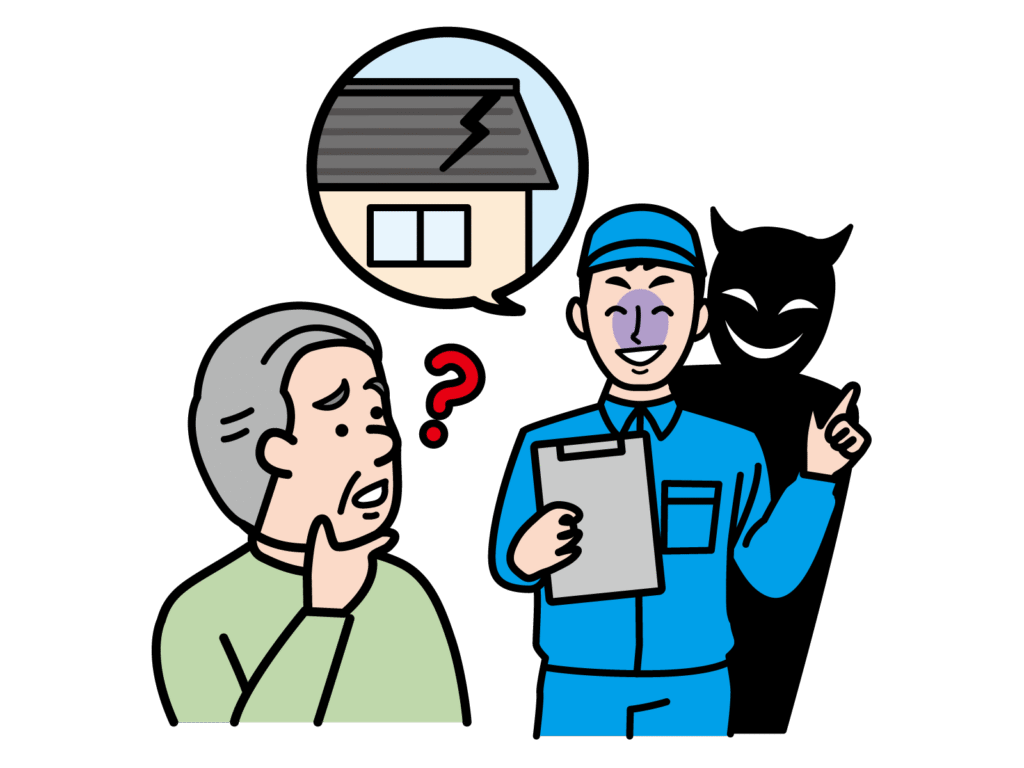 実際にうちで葺き替え工事をしたお客様も被害に遭い、近くで工事してる業者が点検と称して屋根に上り、実際は壊れていない屋根を意図的に壊し、
